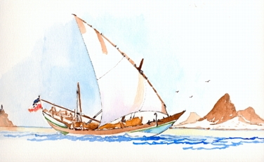 Environs de Bab el Mandeb, grand Sambouc du Yémen, aquarelle par H.M. in Xavier Beguin Billecocq : Boutres d'Arabie. Collection Relations internationales et culture, 2003.