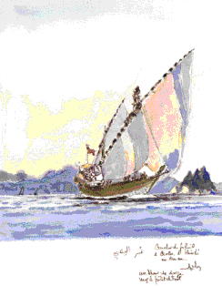 Ce zaroug « au plus près » à la bonne main, négocie la chicane des bans d'entré à la rade de Djeddah. Dans l'après midi lorsque le Shamal remplace les calmes matinaux.
