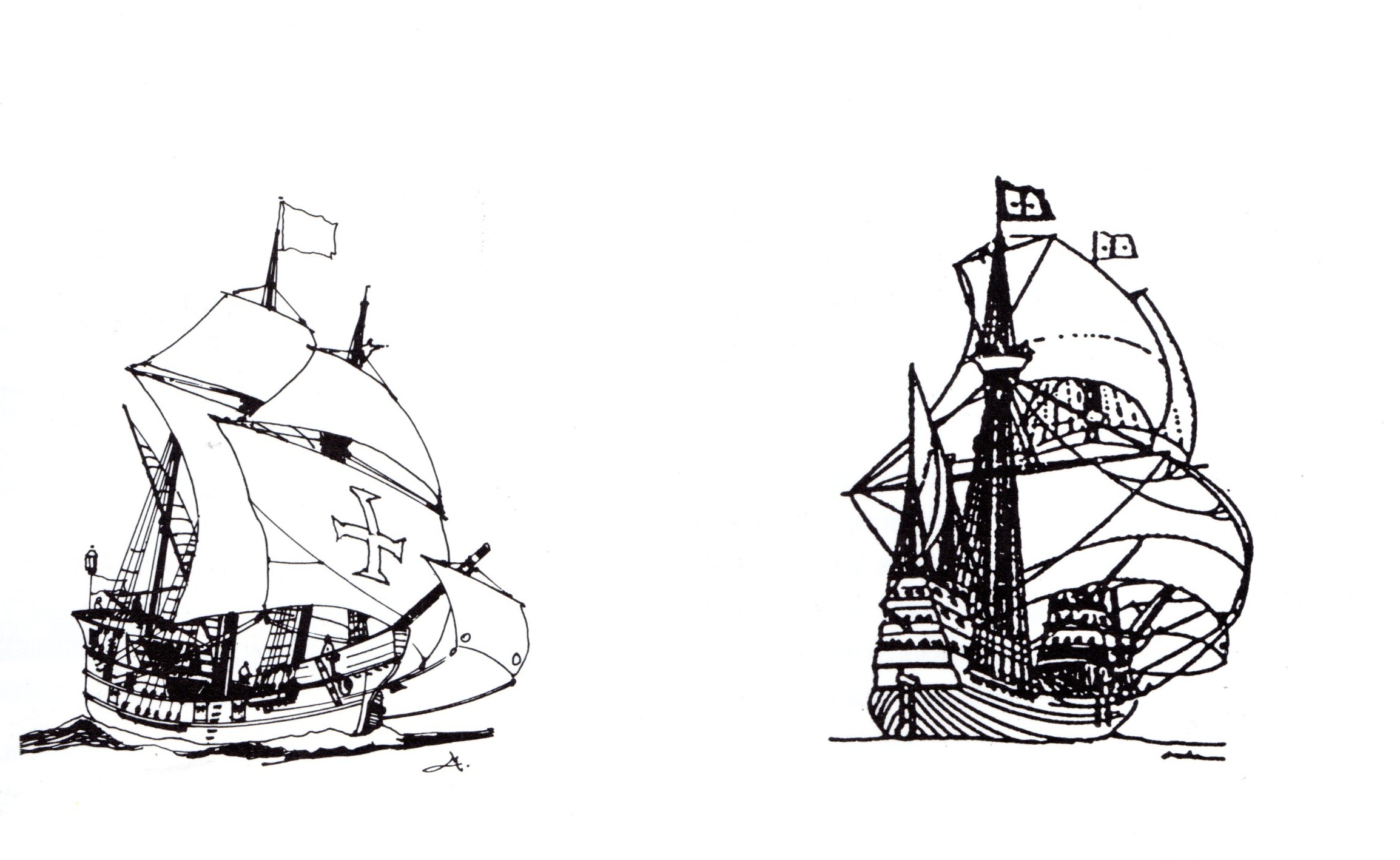 A gauche Nau portugaise à droite Caraque portugaise ex. Nefs Galions et caraques. Dessins par HM