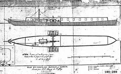 « En 1782 je me rendis à Lyon et je construisis sur la Saône un bateau de 250 milliers (et non 300), mu par une pompe à feu de 24" de diamètre. »