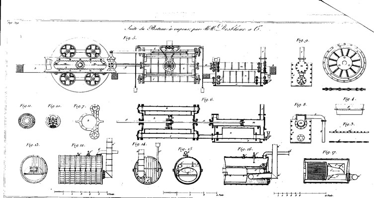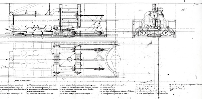 Plan attaché à une demande de brevet complémentaire présentée par Mr Jouffroy en 1817. Ne voulant pas accepter la manivelle de Watt il cherchait encore une autre solution mais la chaudière et la distribution évoluait...