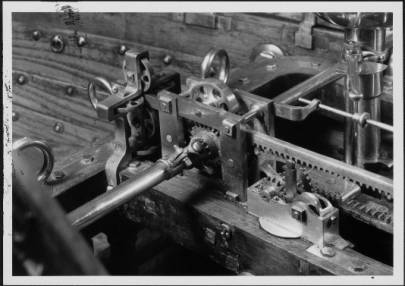 Sur ce cliché on voit la crémaillère supérieure à denture fixe- différente de celle de 1816 montrée ci-après et en dessous la crémaillère, inférieure, qui est déportée de côté. On voit les rouleaux guides verticaux et latéraux. On aperçoit les pignons de la crémaillère verticale qui commande la pompe du condenseur; en haut à droite, la tringle qui commande la distribution de vapeur est attelée à la crémaillère et donc au piston principal par une potence coudée.