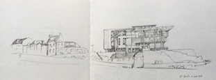La reconstruction de l'hôtel Sainte-Barbe s'achève , dessin au crayon (juin 2018) .