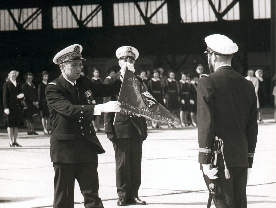 Le CA. Lebreton Oliveau Directeur des Réserves de la Marine remet le premier fanion de la PMM au LV(r ) H. Michea chef de centre CF. Kiefer ;